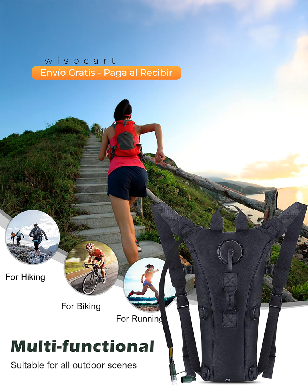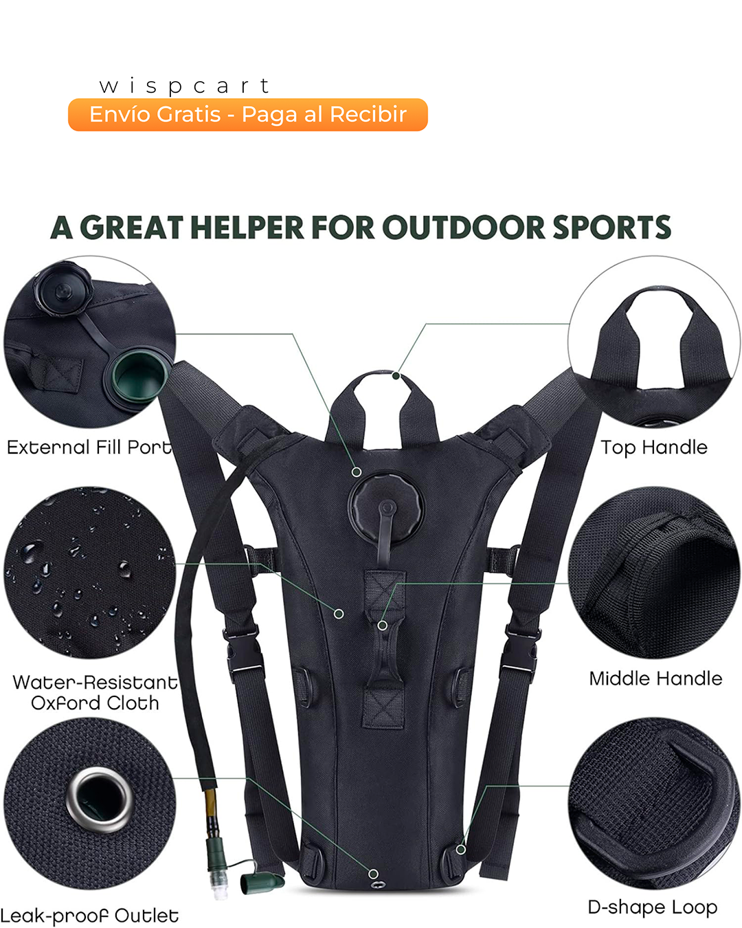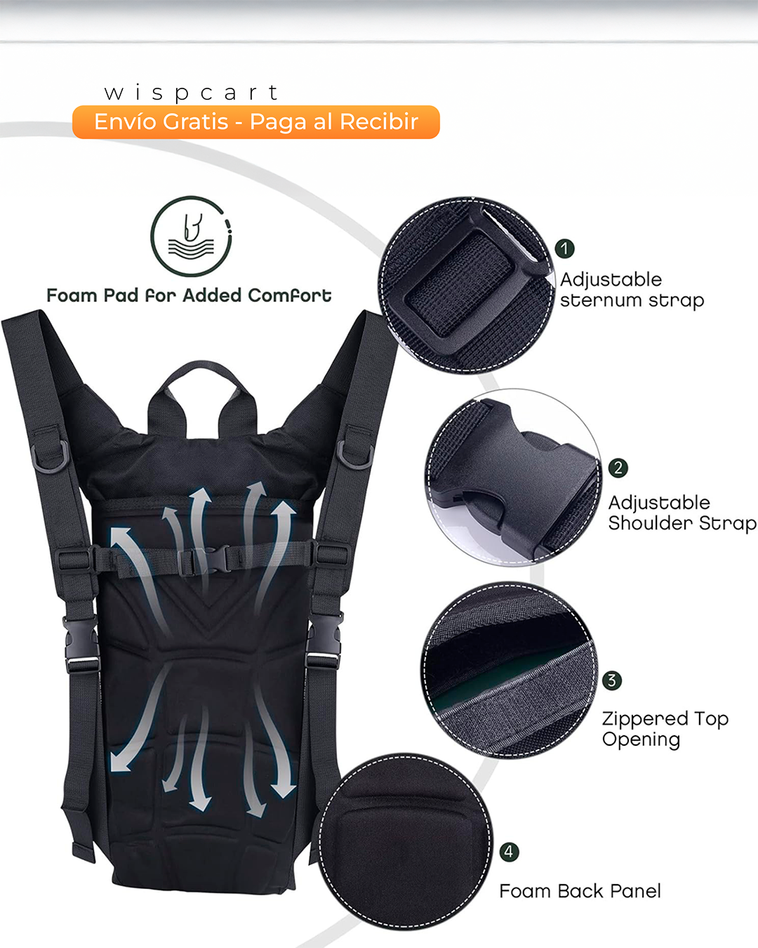 Hidrátate en cada aventura con la mochila de hidratación. Ligera y cómoda, es la compañera perfecta para correr, pedalear o hacer senderismo. Incluye una vejiga de hidratación de 2.5 litros, libre de BPA y con una válvula de mordida para un flujo de agua sin esfuerzo. Su diseño ergonómico, con correas ajustables y un panel trasero acolchado y transpirable, te asegura el máximo confort. Además, está fabricada con tela Oxford 800D, lo que la hace resistente a rasgaduras, y cuenta con un bolsillo trasero para guardar tus esenciales de forma segura.